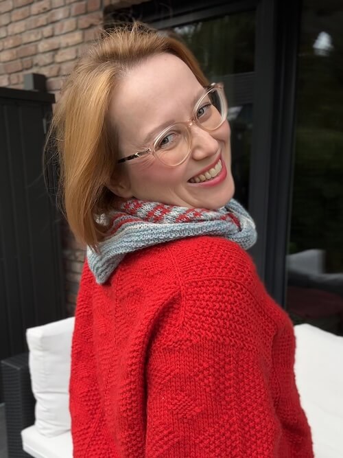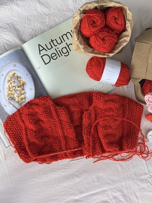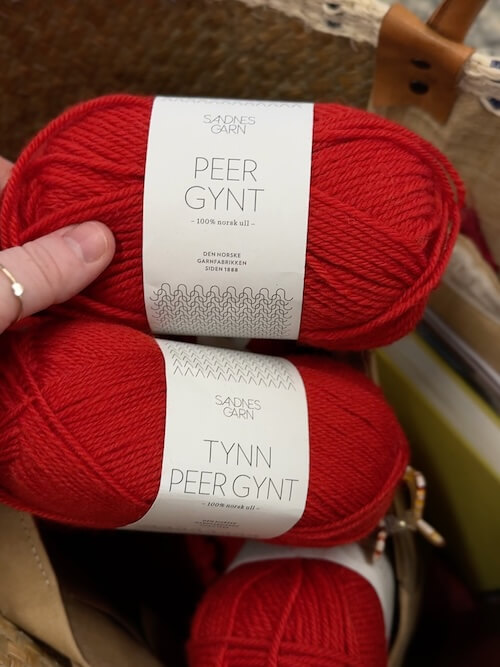 Für meine zweite Esther Jacket habe ich mich für Sandnes Garn Peer Gynt (50 g = 91 m) und Tynn Peer Gynt (50 g = 205 m) in der Farbe 4018 entschieden – ein intensives, klassisches Rot. Diese Kombination hat perfekt zur Maschenprobe gepasst.