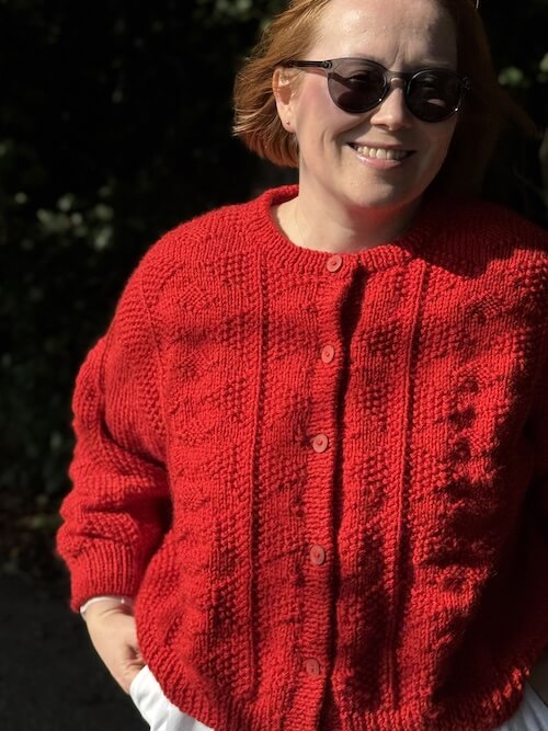 Die Esther Jacket von PetiteKnit ist eine klassische Strickjacke, die von oben nach unten im Strukturmuster gestrickt wird. Zuerst entsteht das Rückenteil mit Zunahmen, anschließend werden die Schultern aus aufgenommenen Maschen gearbeitet, die in die Vorderteile übergehen. Danach werden Rücken und Vorderteile verbunden und in Reihen bis zum unteren Bündchen gestrickt. Zum Schluss folgen die Ärmel, die Knopfleiste und ein Rippenbündchen am Halsausschnitt.